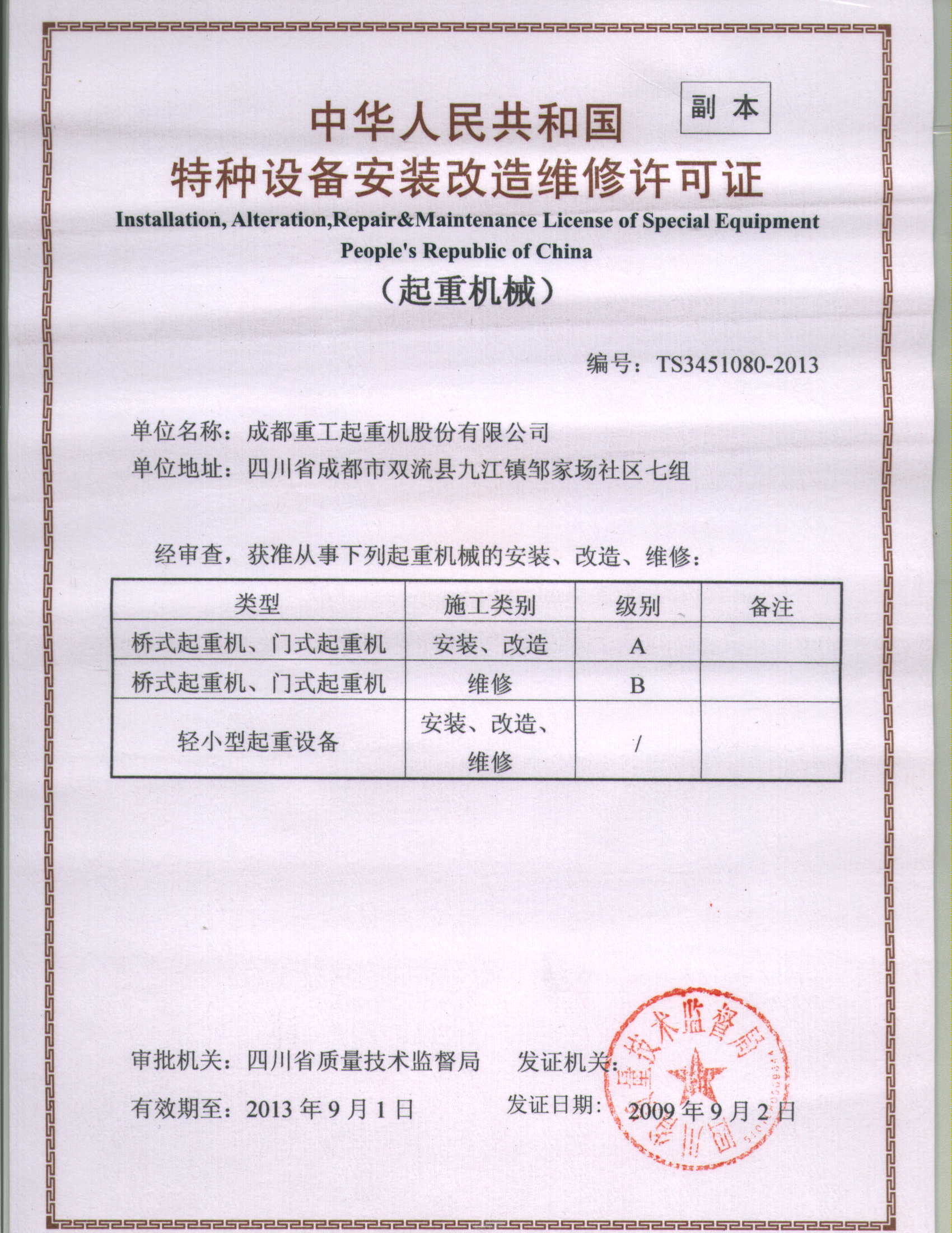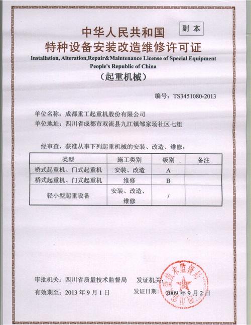 成都重工起重機股份有限公司©2012 版權所有 地址:成都市雙流西南航空港經濟開發區空港三路903號